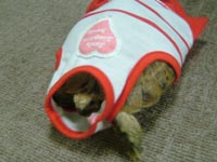 洋服を来たリクガメ、チョコちゃんの写真です。 っというか犬用の服なので合ってないけど…